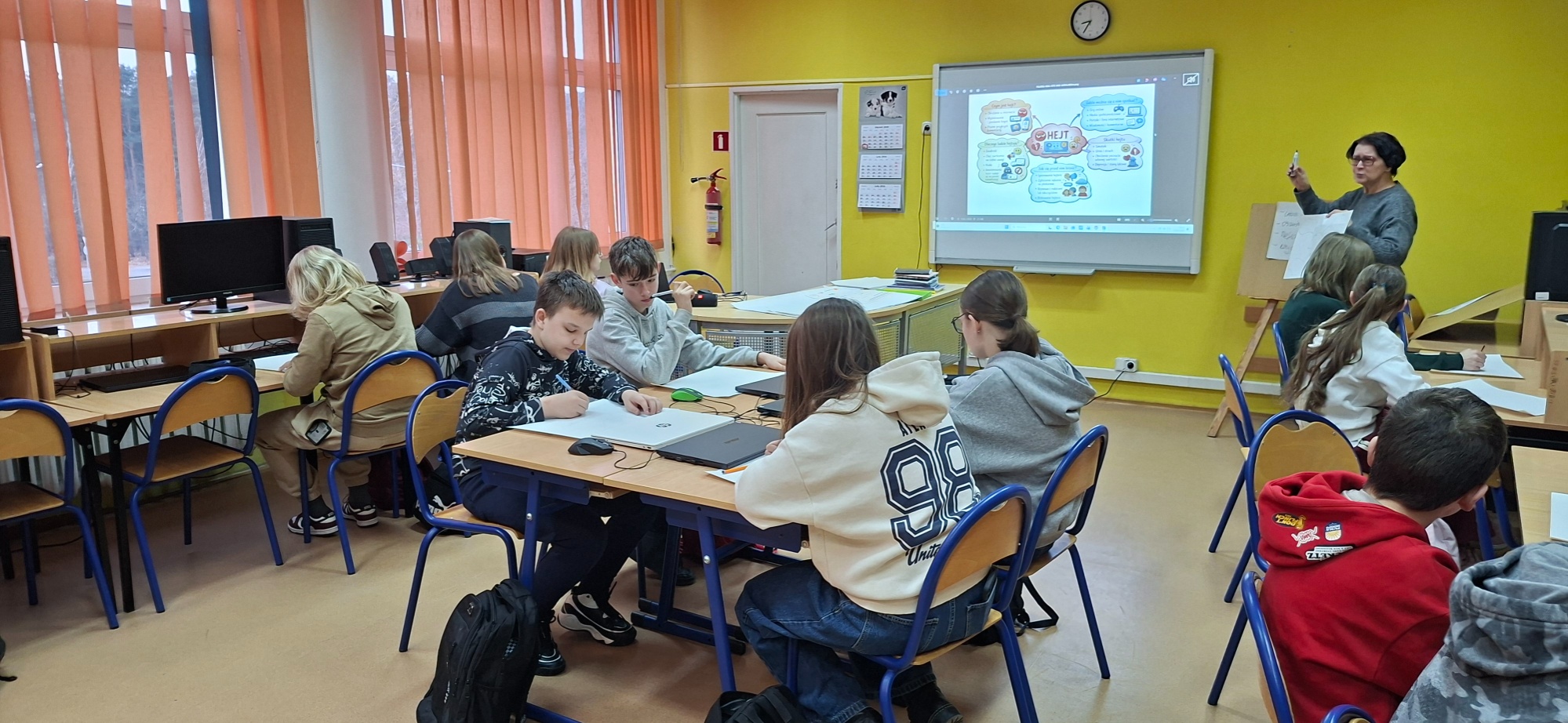 Aktywność uczniów pokazała nam to, że dzieci mają dużą świadomość zagrożeń w internecie. Wiedzą, czym jest hejt, potrafią wskazać niebezpieczeństwa związane z udostępnianiem danych osobowych, rozumieją, że nie każda osoba w sieci jest tym, za kogo się podaje. Uczniowie przyznawali, że nie warto klikać w podejrzane linki czy też odpowiadać na wiadomości od nieznajomych. A jednak pomimo tej wiedzy, wciąż zdarza się, że ciekawość bierze górę. Rozmawialiśmy także o informowaniu dorosłych o niepokojących sytuacjach w sieci, aby szukać wsparcia wśród dorosłych.