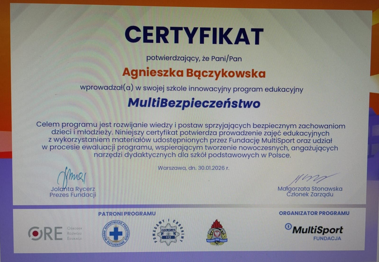 W ramach programu edukacyjnego MultiBezpieczeństwo, przygotowanego przez Fundację MultiSport pod patronatem Orodka Rozwoju Edukacji, Komendy Głównej Policji, Komendy Głównej Państwowej Straży Pożarnej oraz Wodnego Ochotniczego Pogotowia Ratunkowego uczniowie poszerzyli swoją wiedzę oraz utrwalili poprzez pracę zespołową. Uczniowie z pewnością teraz wiedzą jak dbać o siebie i innych.