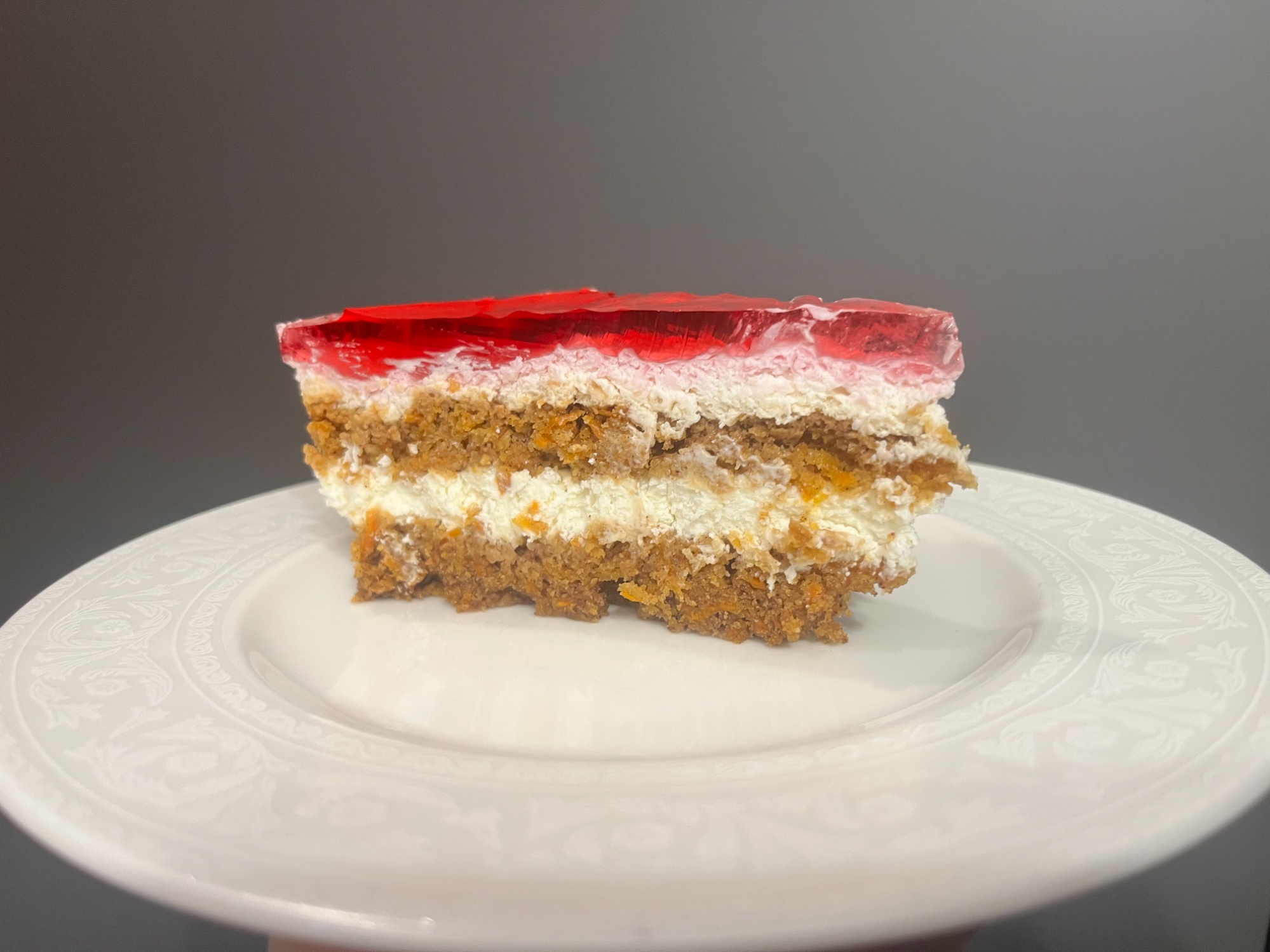 ciasto wystygnie, przekrój je, a następnie nałóż warstwę sera i ostudzoną galaretkę.Smacznego!